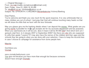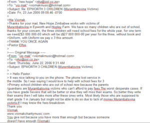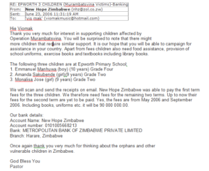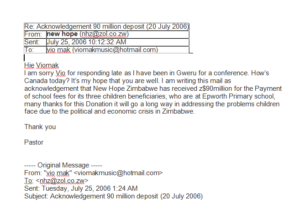 On 20 July 2006 Viomak donated ZW$90 000 000.00 to New Hope Foundation, now Defence For Children International Zimbabwe, through Elfas Zadzagomo to help with paying school fees, buy uniforms, stationery and text books for orphaned children .Thereafter Viomak made cash donations to the organisation on 4th April 2007, November 2008 and May 2009 to support with the upkeep of children in need. Many of the children are victims of ZanuPF’s operation murambatsvina (Clean the filth) which saw the government destroy people’s houses leaving many destitute and homeless. Through New Hope Foundation Viomak continues to support children affected by operation Murambatsvina which left more than 5000 people homeless. Children who have benefited at Epworth Primary School for one year fees are Emmanuel Manhuwa 10 years, grade four, Amanda Sakubende 9 years, grade two and Monalisa Jose 9 years, grade two. Through New Hope Foundation Viomak has donated to Faith Based Fellowship Zimbabwe’s orphaned sick children under the care of the organisation.
